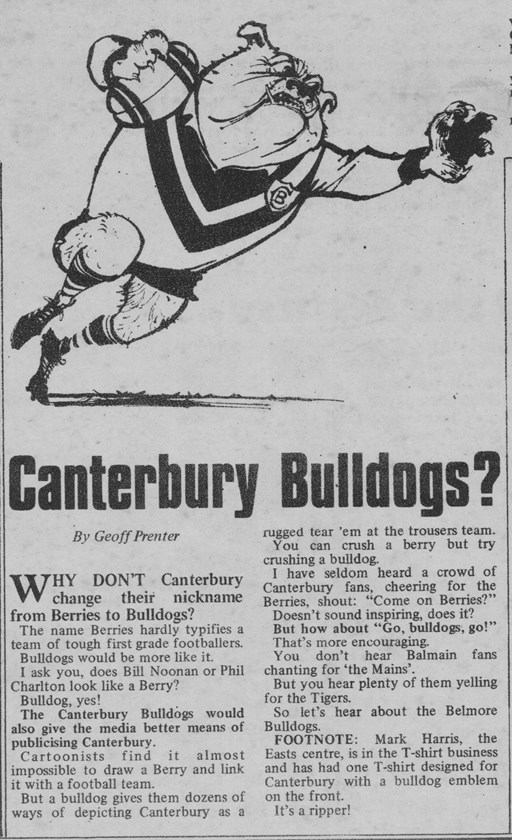The transition from 'Berries' to 'Bulldogs' in 1977 was simply a case of necessity. Canterbury was the only Club without a mascot for its emblem. Even the relatively new clubs (at the time), Cronulla and Penrith were known respectively as the Sharks and the Panthers.
