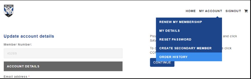 Hover over ‘My Account’ to display the drop-down menu and select ‘Order History’. Please note that loading the ‘Order History’ page can take some time.