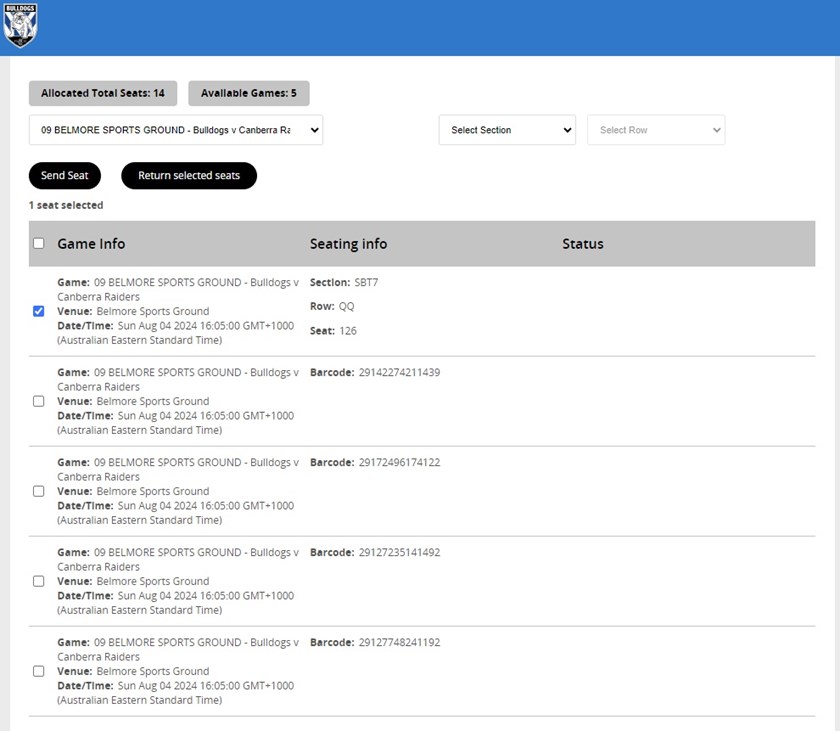 Then, select the seats that you wish to return for the game that you have selected before clicking on the Return Selected Seats button:
