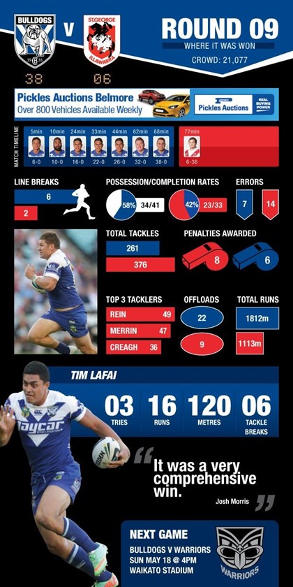 The Bulldogs defeated the St George Illawarra Dragons 38-6 on Sunday May 11 at ANZ Stadium. Here are the stats from the game with the post match Info-graphic.