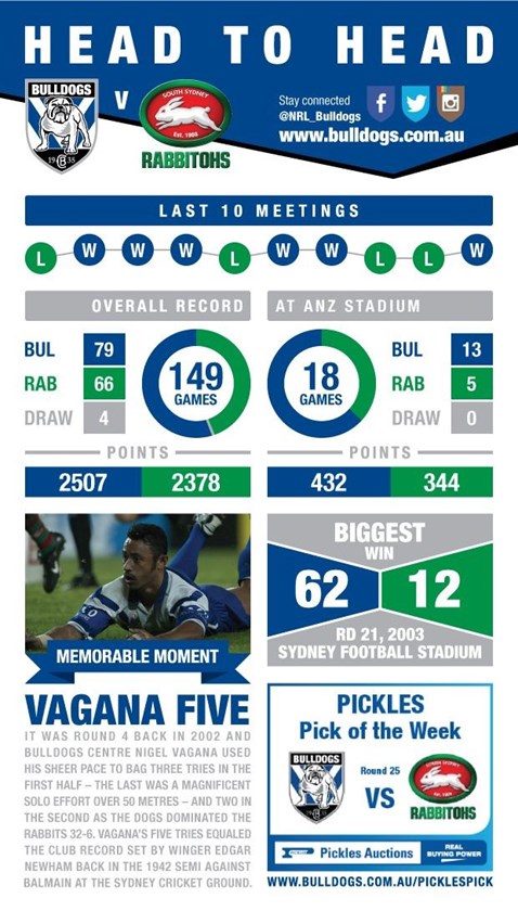 The History: Played 148; Canterbury-Bankstown 78, South Sydney 66, drawn 4. Having being swept in both games against the foundation club last season, the Bulldogs can clinch their own sweep after taking out their Round 7 clash on Easter Monday on a Trent Hodkinson field goal. Here's an interesting tid-bit: a win would also give the Bulldogs their 79th victory over the Rabbitohs, which would be their highest count against any team in the NRL.