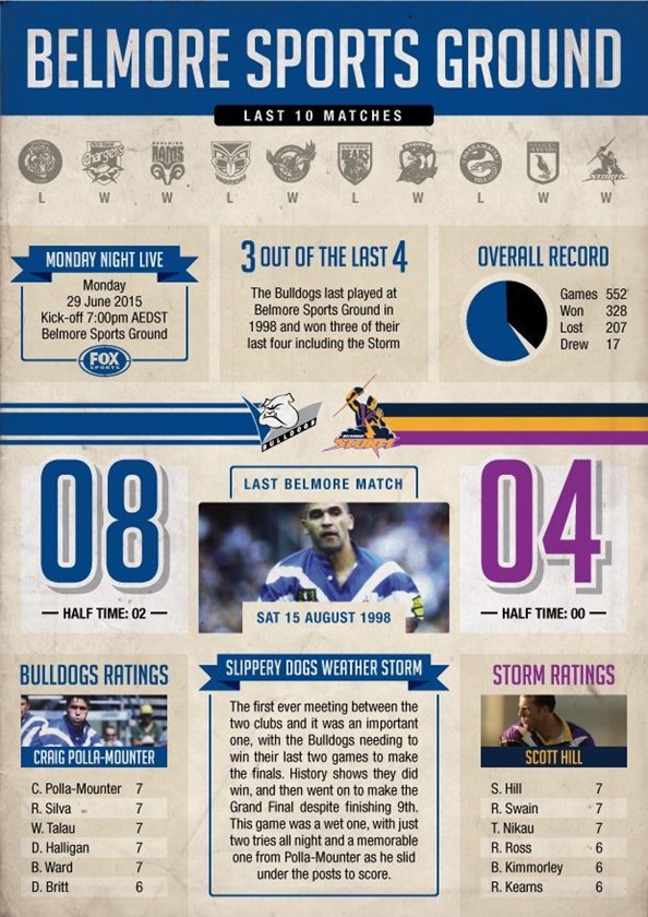The 5 things you need to know about the round 16 clash between the Canterbury-Bankstown Bulldogs and the Melbourne Storm.
