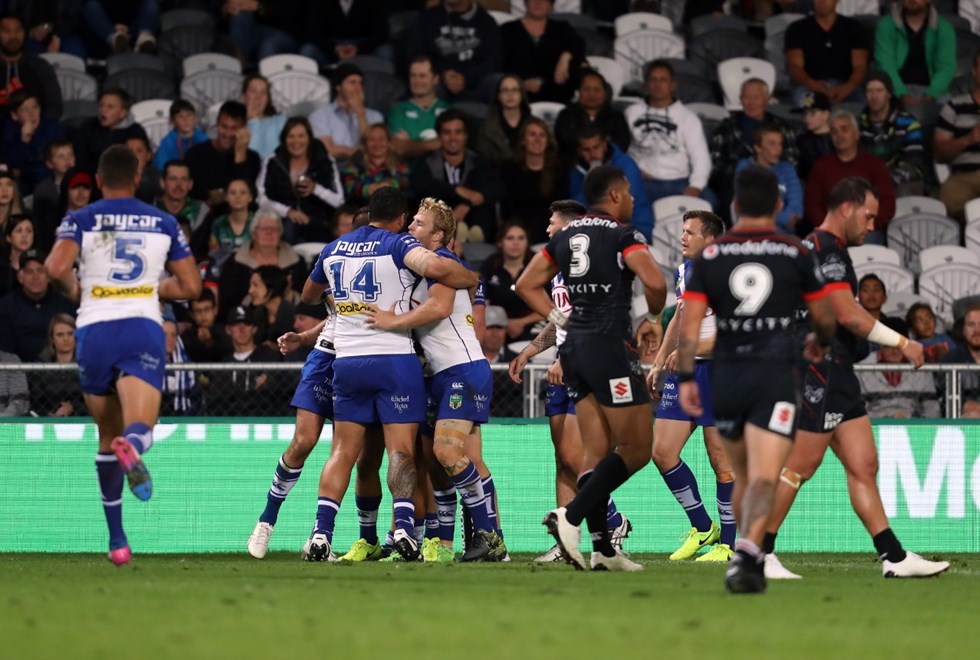 Canterbury Bulldogs 24 (Moses Mbye, Brett Morris x2, Marcelo Montoya tries; Mbye 4 goals) lead New Zealand Warriors 12 (Bodene Thompson, Shaun Johnson try; Johnson 2 goals) at Forsyth Barr Stadium. Half-time: 10-6.
