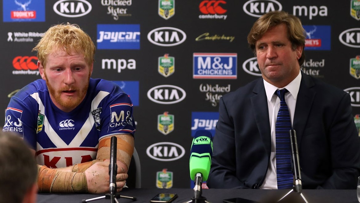 Des Hasler and James Graham address the media following the 16-2 win over the Dragons at ANZ Stadium.