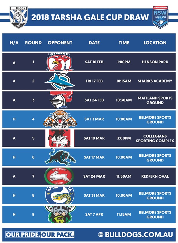 Full Canterbury-Bankstown Bulldogs draw for the 2018 Tarsha Gale Cup season