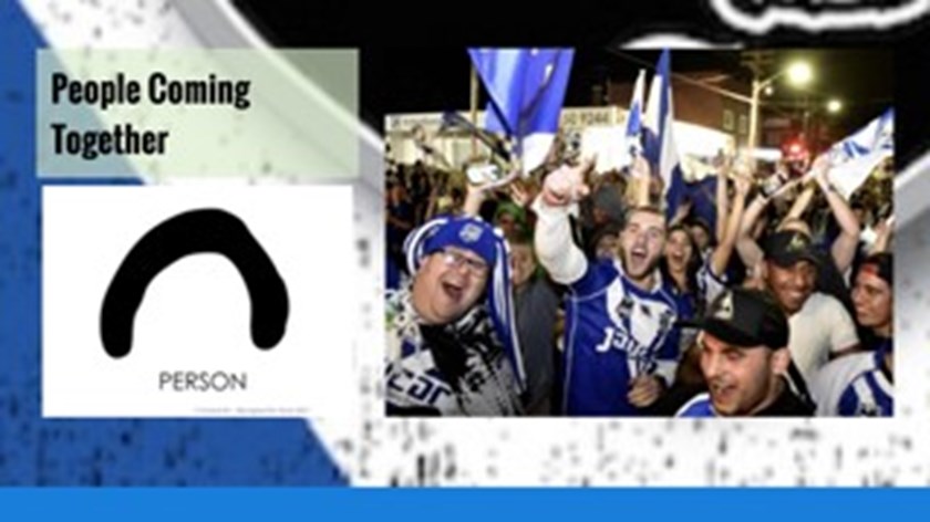 The paw print is a symbol that was used last year to represent the Bulldogs. It featured four water spirits. These beings dance along the water to give us a vision of who we are. They look after the land and water. This reminds everybody, black or white, that it is our responsibility to look after the water, as it is one of our main sources of life.