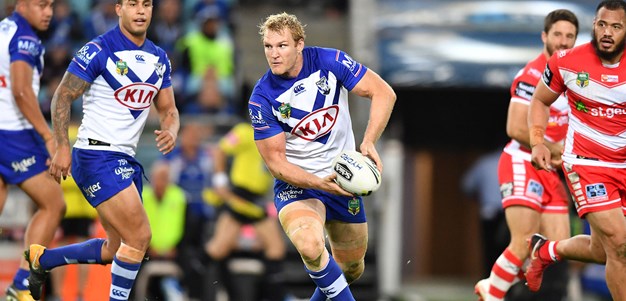Josh Morris collects a Lachlan Lewis grubber kick to score the Bulldogs opening try of the match against the Dragons.