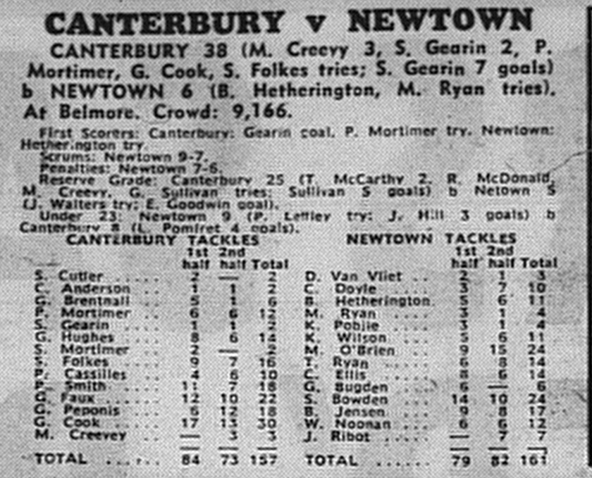 Although the jets were down two men, they did lead 7-3 at the break, but the inclusion of Mal Creevey for Canterbury and the loss of Newton fullback Phil Sigsworth saw the momentum turn in favour of the Dogs.