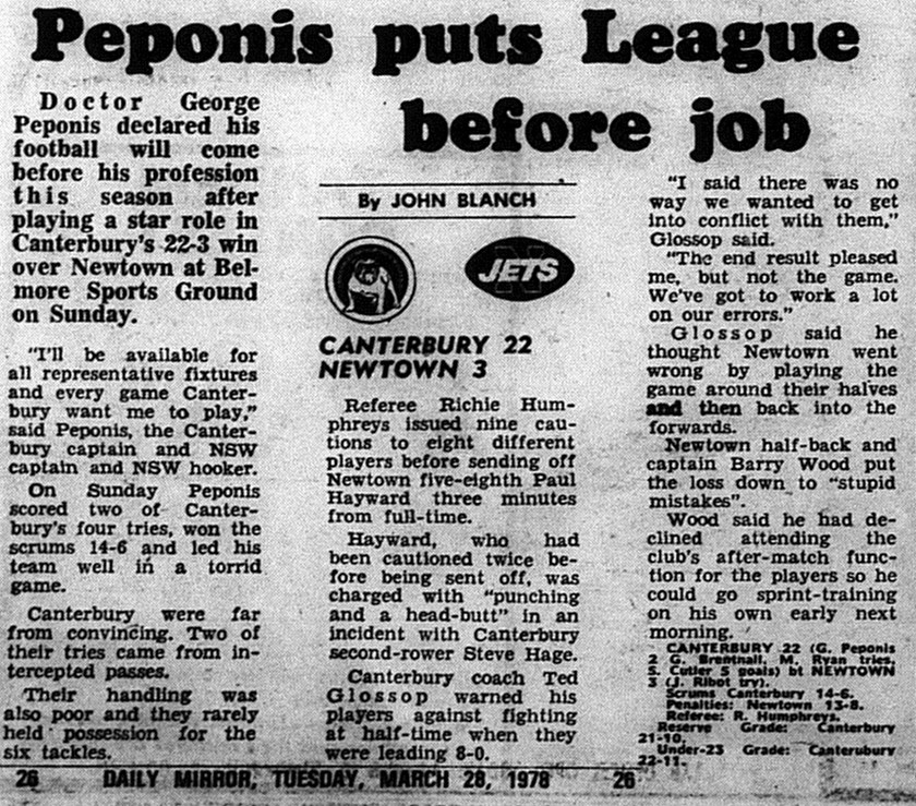 Canterbury claimed a 22-3 victory over the Jets at Belmore Sports Ground thanks to an inspiring performance from captain and hooker Doctor George Peponis.