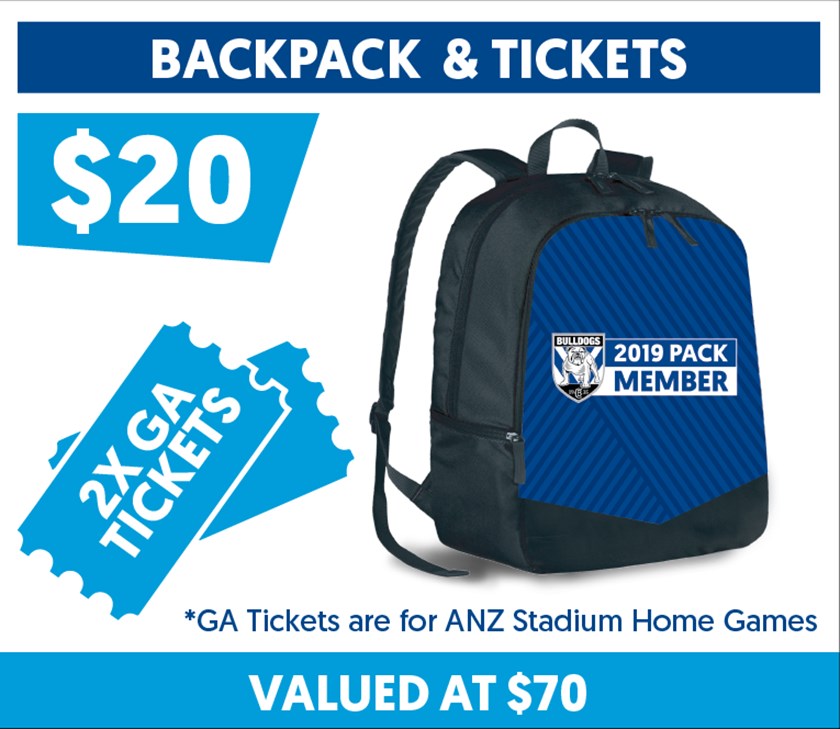 * A special edition Members Exclusive Backpack to keep all your Bulldogs goodies in one place or perfect to bring all your pieces to game day, PLUS two General Admission tickets for a ANZ Stadium Bulldogs Home Game.