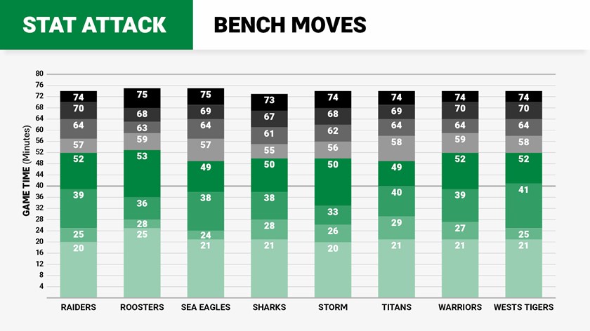 A coach's use of the interchange bench often brings interest to rugby league fans. Spectators will debate why a player hasn't returned to the field, or how many minutes a player can average and whether they're being best utilised with significant game time.