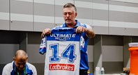 Joe Stimson receives his first Bulldogs jersey from his dad inside the dressing rooms ahead of the club's clash with the Eels.