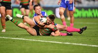 Jayden Okunbor wins another kick contest on the left edge and offloads the ball back to Raymond Faitala-Mariner who scores another Bulldogs try