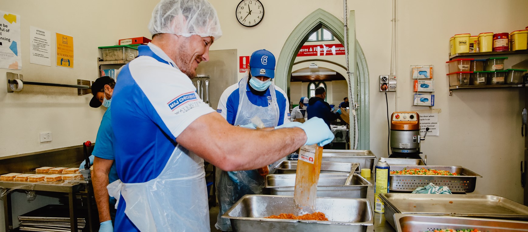 In an outstanding display of putting back into the community over 20 Bulldogs players and staff today gave up their free time on only their second day out of the ‘bubble’ to visit the homeless at the Rev Bill Crews Foundation in Ashfield.