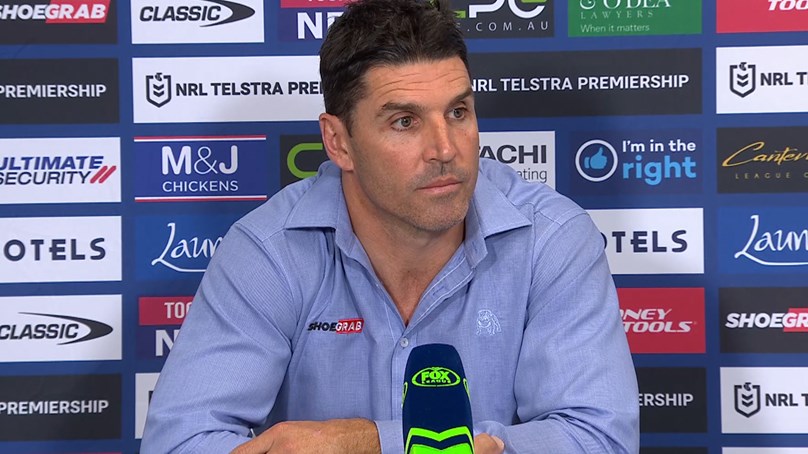 Trent Barrett chats to the media after the Bulldogs' Round 18 clash with the Rabbitohs
