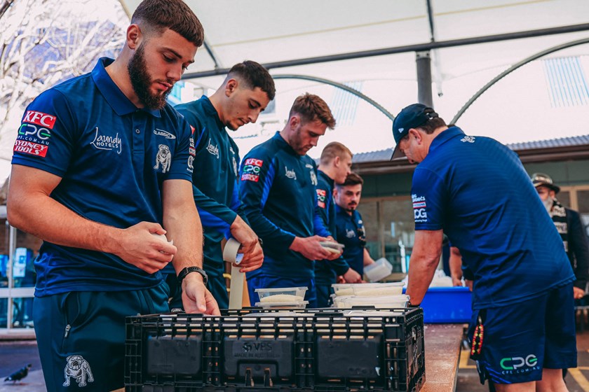 The Canterbury-Bankstown Bulldogs have spent their Monday giving back in the kitchen and the cool room at the Loaves and Fishes Restaurant in Ashfield, to support the Rev Bill Crews Foundation.