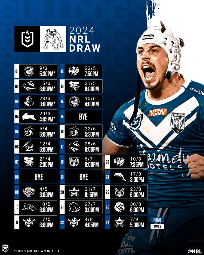 If last year's form is anything to go off, the Bulldogs have a tricky schedule of home and away fixtures in 2024 with two meetings set down with the Sharks, Roosters, Knights, Raiders and Warriors, who all made the post-season last year. They also take on the Eels, Dragons and Cowboys twice.