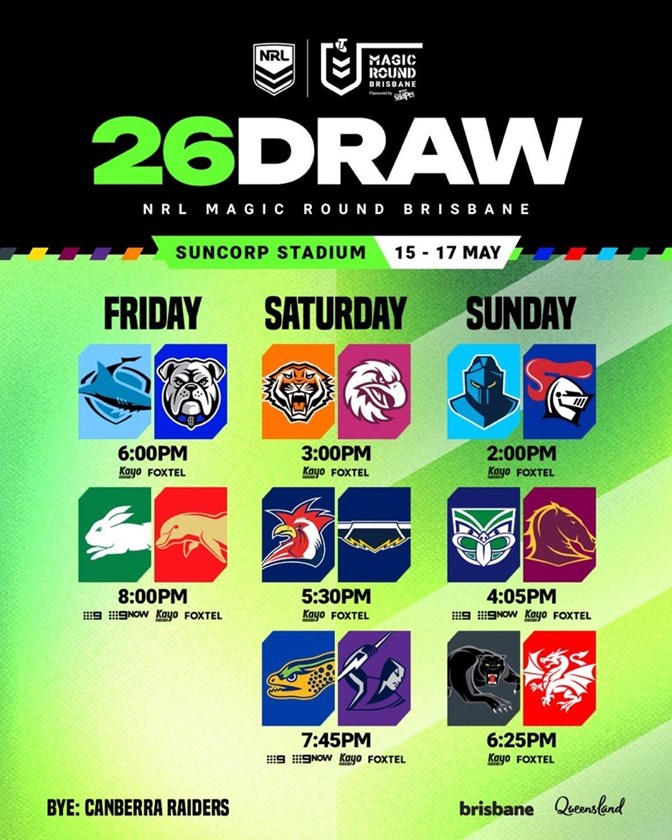 The schedule has been confirmed for NRL Magic Round Brisbane 2026 and the mega weekend of footy features eight blockbuster clashes, kicking off the day after Women's Origin Game 2.